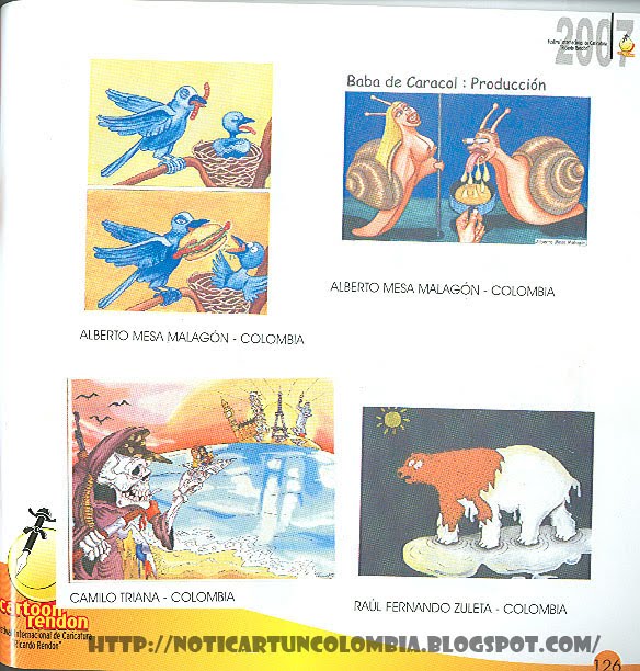 En esta entrada con mucho gusto les tengo las imágenes de las obras colombianas seleccionadas en el catálogo del CARTOONRENDON 2007, en este año se le rindió homenaje al gran maestro del dibujo humorístico en Colombia (Me incluyo dentro de sus aprendices a la distancia), el señor Jairo Alberto Álvarez Osorio"JAIRO A." y en este año el invitado especial fué el talentoso Carlos Cardona.