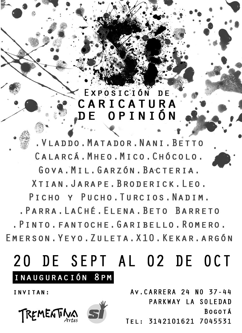 Les comparto esta invitación a la exposición de caricaturas de opinión por el Sí del plebiscito por la paz que ya está en vísperas de realizarse. Se verán cartones de (orden alfabético): ARGÓN, BACTERIA, BETO BARRETO, BETTO, BRODERICK, CALARCÁ, CHÓCOLO, ELENA, EMERSON, FANTOCHE, GARIBELLO, GARZÓN, GOVA, JARAPE, , KEKAR, LACHÉ, LEO, MATADOR, MIL, NADIM, NANI, PARRA, PICHO&PUCHO, PINTO, ROMERO, TURCIOS, YEYO, XTIAN, X10 y ZULETA.